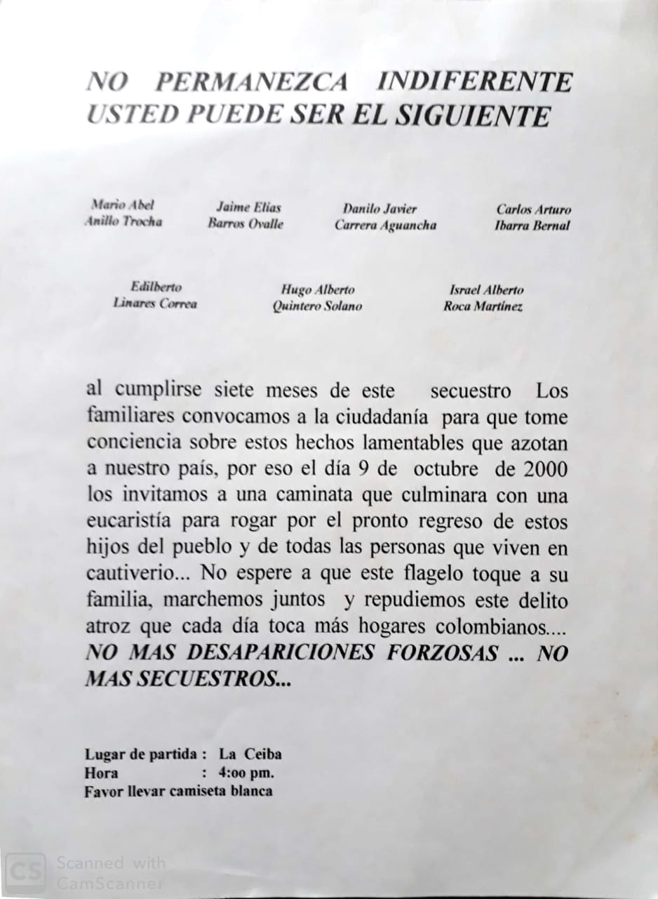 Los familiares de los siete agentes del CTI desaparecidos el 9 de marzo de 2000: Edilberto Linares Correa, Danilo Carrera Aguancha, Carlos Ibarra Bernal, Hugo Quintero Solano, Israel Roca Martínez, Mario Anillo Trocha y Jaime Barros Ovalle, se reúnen constantemente luego de la desaparición, para empezar acciones de reclamación a la Fiscalía y búsqueda por su cuenta, en medio de estas reuniones empiezan a llamar a los investigadores “Los Muchachos del CTI” debido a que ninguno pasaba los 30 años de edad.