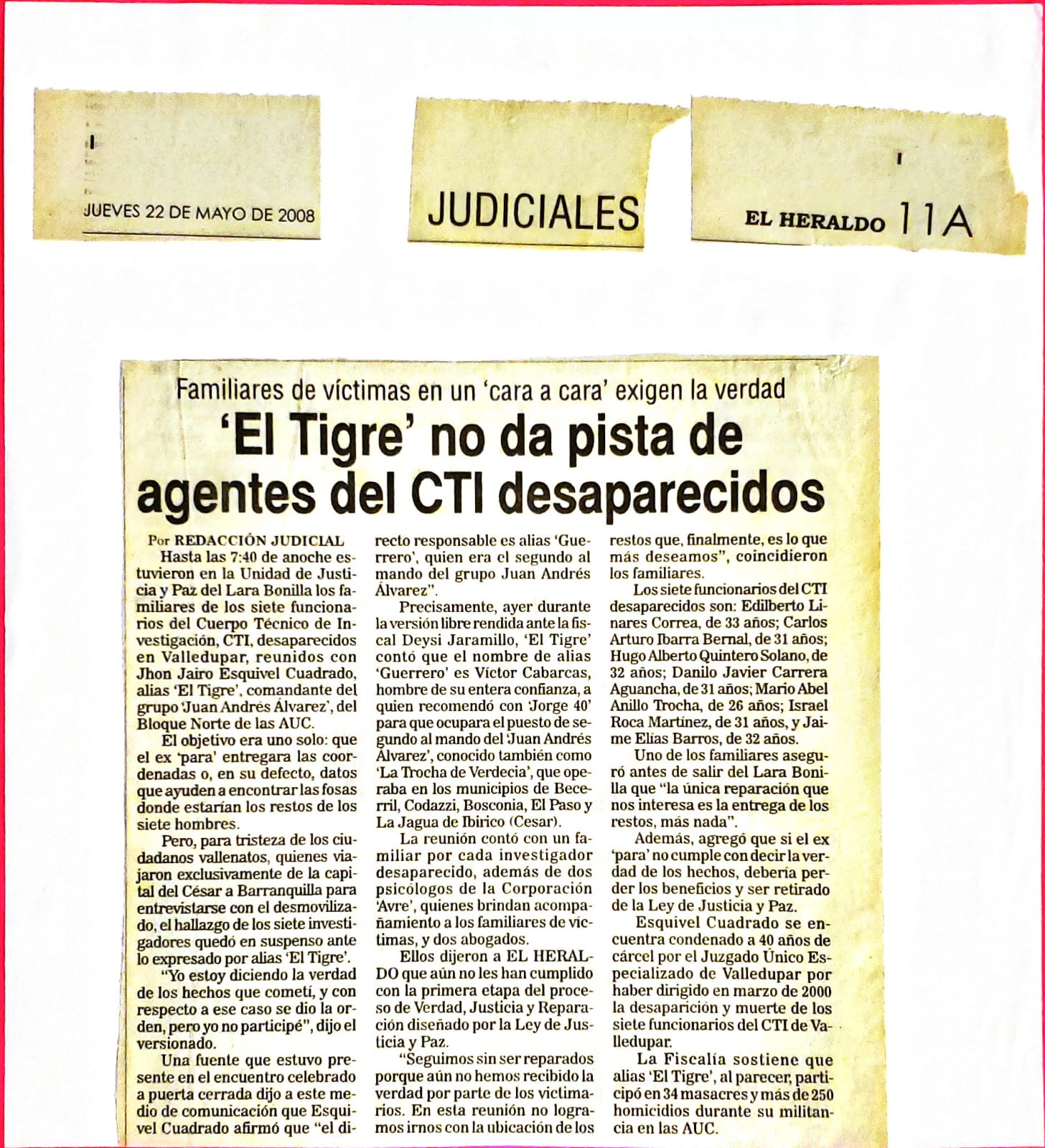 En marzo del 2007 en la ciudad de Barranquilla se instala audiencia de Justicia y Paz con uno de los principales implicados en el caso, John Jairo Esquivel Cuadrado alias “El Tigre” reconoce su participación en el hecho de la desaparición y presunta muerte de los agentes del CTI, señala que la orden fue directamente de Carlos Castaño y fue supuestamente por tener nexos con la guerrilla de las FARC. Los familiares se sienten humillados por la actitud cínica y desobligante de alias “El Tigre” y por no obtener una verdad completa de los