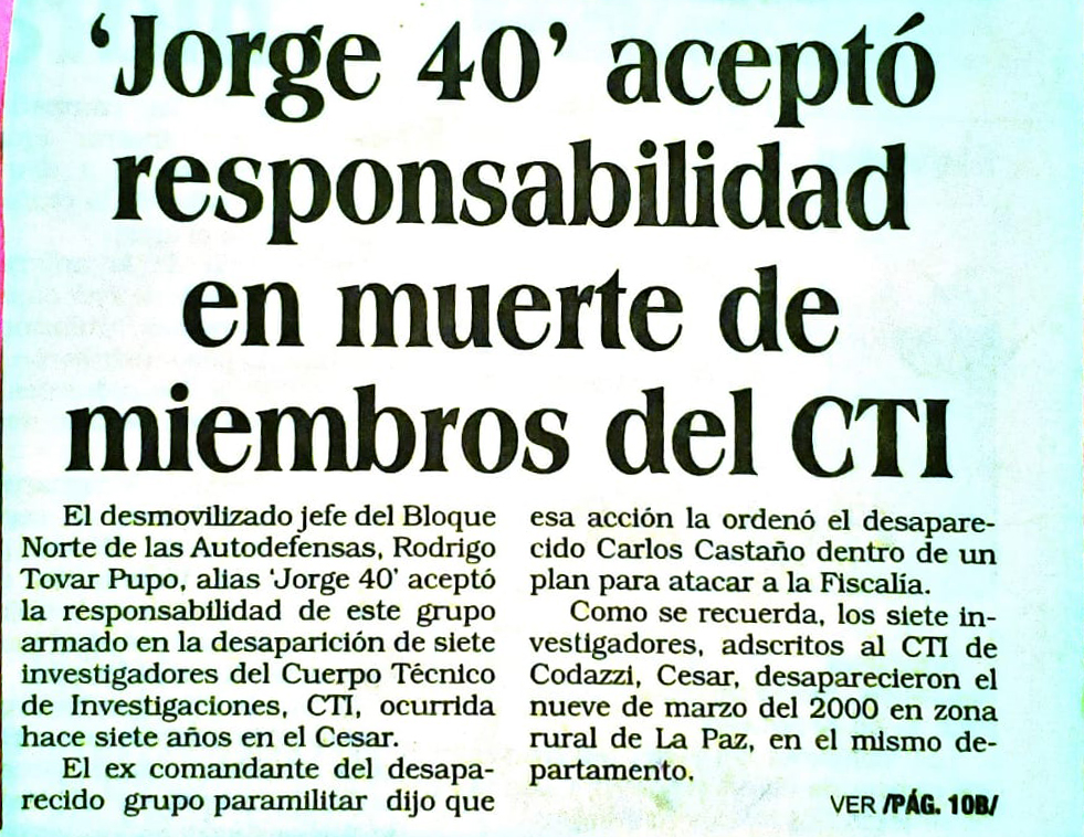 Los familiares de “Los muchachos del CTI” han emprendido acciones de búsqueda por su cuenta, de manera temeraria sin medir los riesgos ni las consecuencias posibles. En medio de este camino doloroso de búsqueda, entre otras acciones, acudieron ante Carlos Castaño y alias “Jorge 40”, principales jefes armados del Paramilitarismo en Colombia. Los
